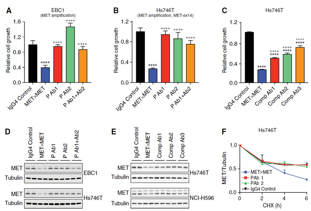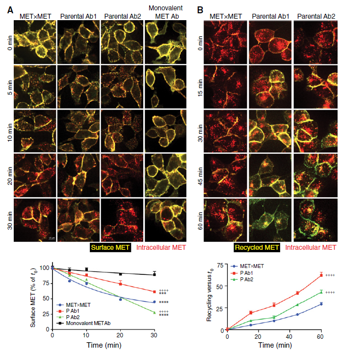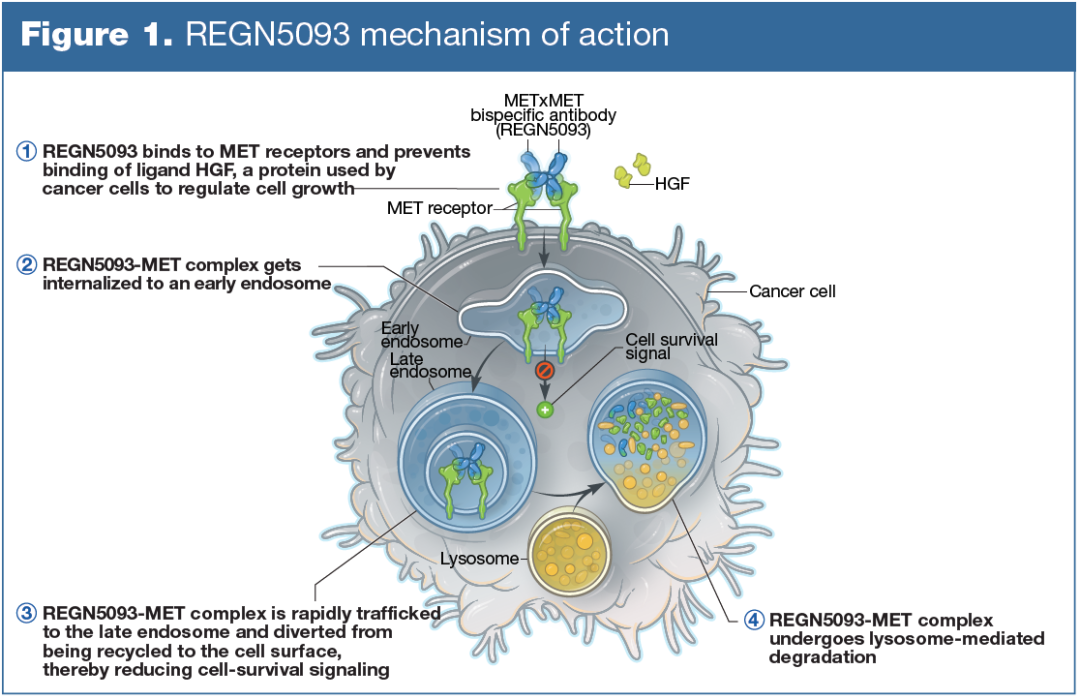 REGN5093靶向MET的两个不同表位,阻止HGF的结合。REGN5093集合MET之后,快速的内化并锁定在次级内体中被降解,减少了MET的循环。