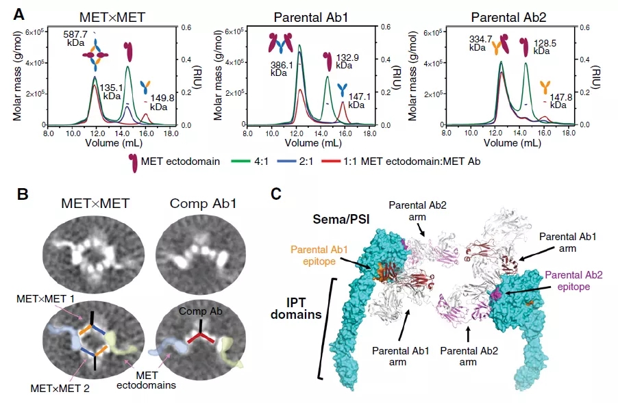不同于母本单抗与MET以1:2形式的结合形式,REGN5093与MET形成2:2形式的复合体,如下图C所示。