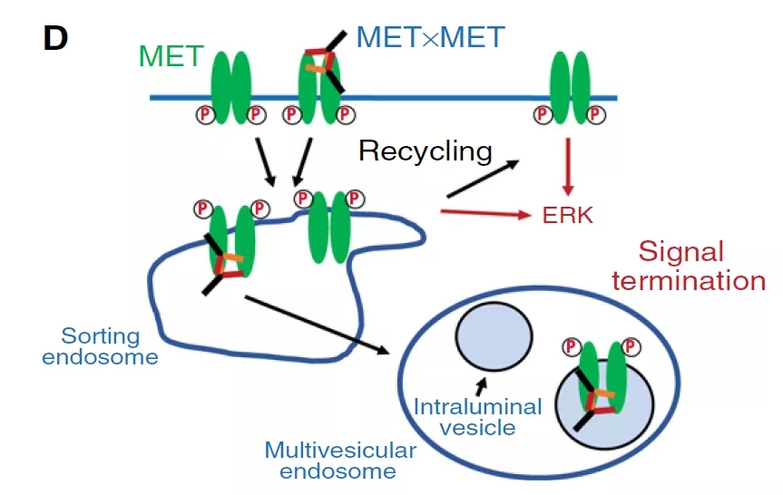 以往的MET抗体常会表现出一定的激活效应,而REGN5093完全没有。再生元科学家的解释如下,MET结合REGN5093之后快速内化,多泡内体中MAP激酶活性部分在物理上被分离,阻断了下游激活途径。