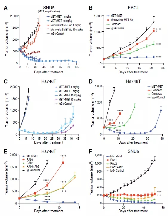 REGN5093在小鼠肿瘤模型中,表现出了极强的抗肿瘤活性,相对两个母本抗体具有很好的协同效应。