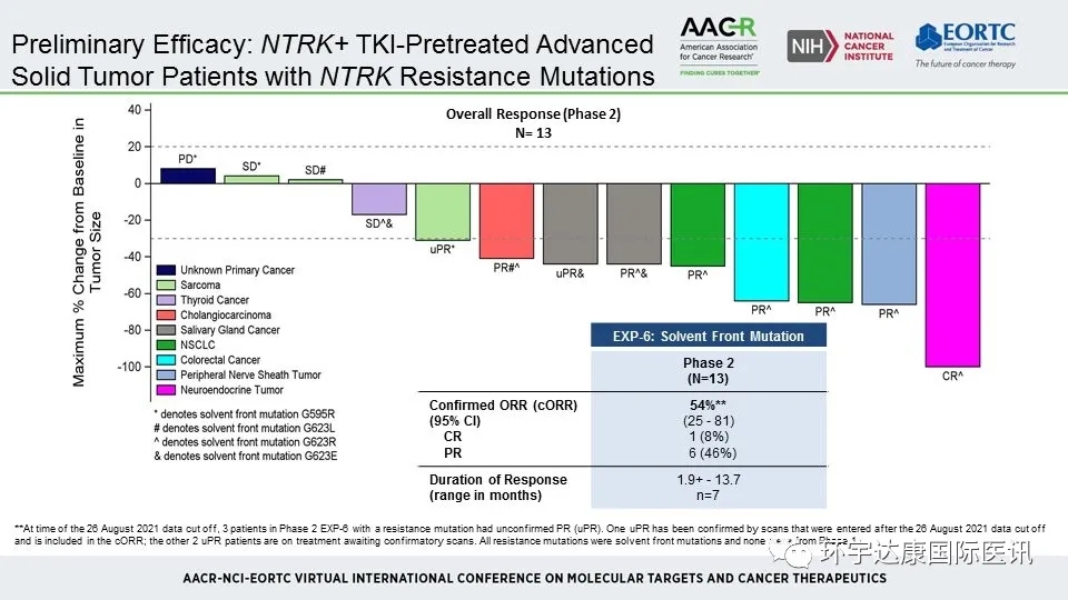 值得一提的是,在23名NTRK阳性TKI预处理的晚期实体瘤患者中,13名(57%)具有NTRK溶剂前沿突变。在这13名患者中,确认的客观缓解率(ORR)为62%,其中还包括一名完全缓解的患者。