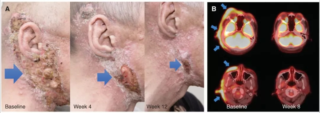 44岁的C先生于2012年10月出现腮腺肿块,手术后病理确诊为分泌性唾液腺癌(MASC),2015年肿瘤复发,基因检测发现ETV6-NTRK3重排,于是C先生入组了恩曲替尼的临床试验,半年的部分缓解后出现了耐药,于是又参加了repotrectinib(每天一次40mg)的I期试验中。在给药的最初几天内,对repotrectinib的反应迅速而显着,治疗8周后出现部分缓解(PR),多个病灶缩小,包括右脸颊,颈淋巴结,胸壁结节以及肺和胸膜结节,肿瘤缩小了82%。截至文献发表时患者仍在接受治疗已经17个月以上。