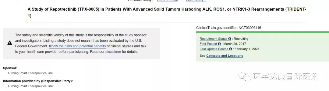 2021年5月,TRIDENT-1中国临床研究在牵头医院正式启动,首例中国大陆受试者通过全球肿瘤医生网抗癌新药招募中心成功入组接受治疗!这意味着,TPX-0005已经正式在国内开始开始招募患者了,国内的患者有机会免费接受最前沿抗癌药物的治疗,想参加的患者尽快联系全球肿瘤医生网医学部吧!