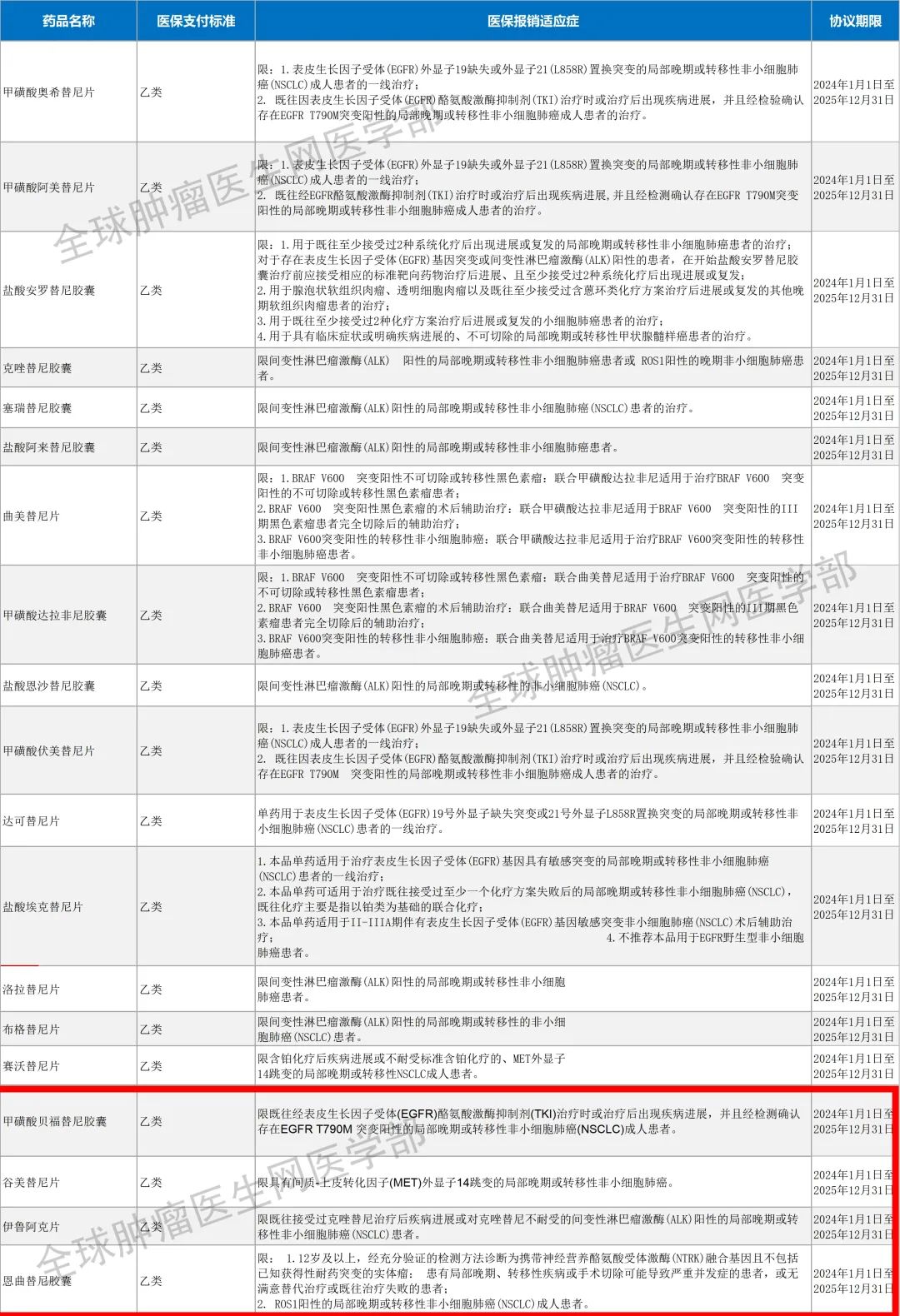 2024医保信息:限既往经表皮生长因子受体(EGFR)酪氨酸激酶抑制剂(TKI)治疗时或治疗后;出现疾病进展,并且经检测确认存在EGFRT790M突变阳性的局部晚期或转;移性非小细胞肺癌(NSCLC)成人患者;有效期2024年1月1日至2025年12月31日