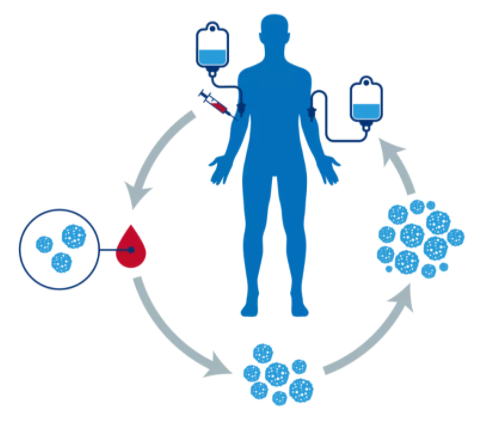 NK细胞免疫疗法使用从患者血液中提取的高纯度NK细胞,扩增并激活后回输患者体内。目的是改善免疫系统功能,消除受感染或异常细胞,防止疾病复发(图片来源:NKGen公司官网)