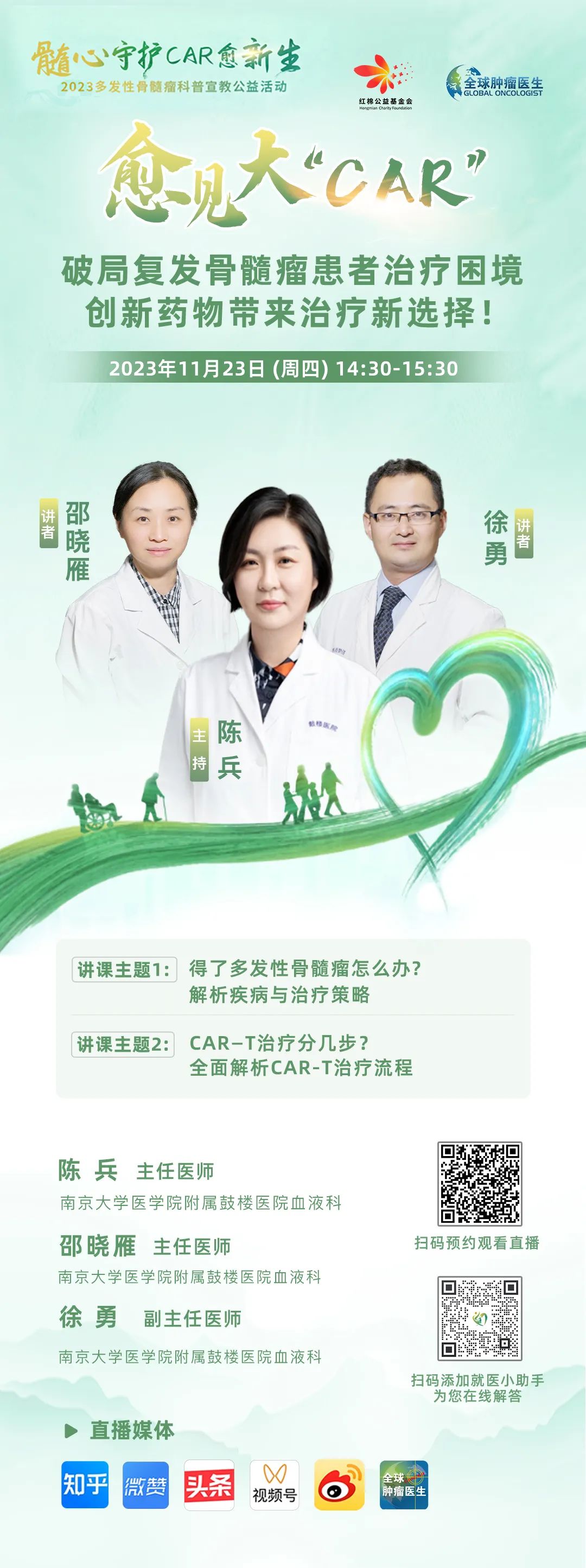 直播预告|愈见大"CAR",2023年11月23日14:30南京大学医学院附属鼓楼医院血液科陈兵、邵晓雁、徐勇三位医生:破局复发骨髓瘤治疗困境,创新疗法CAR-T带来治疗新选择