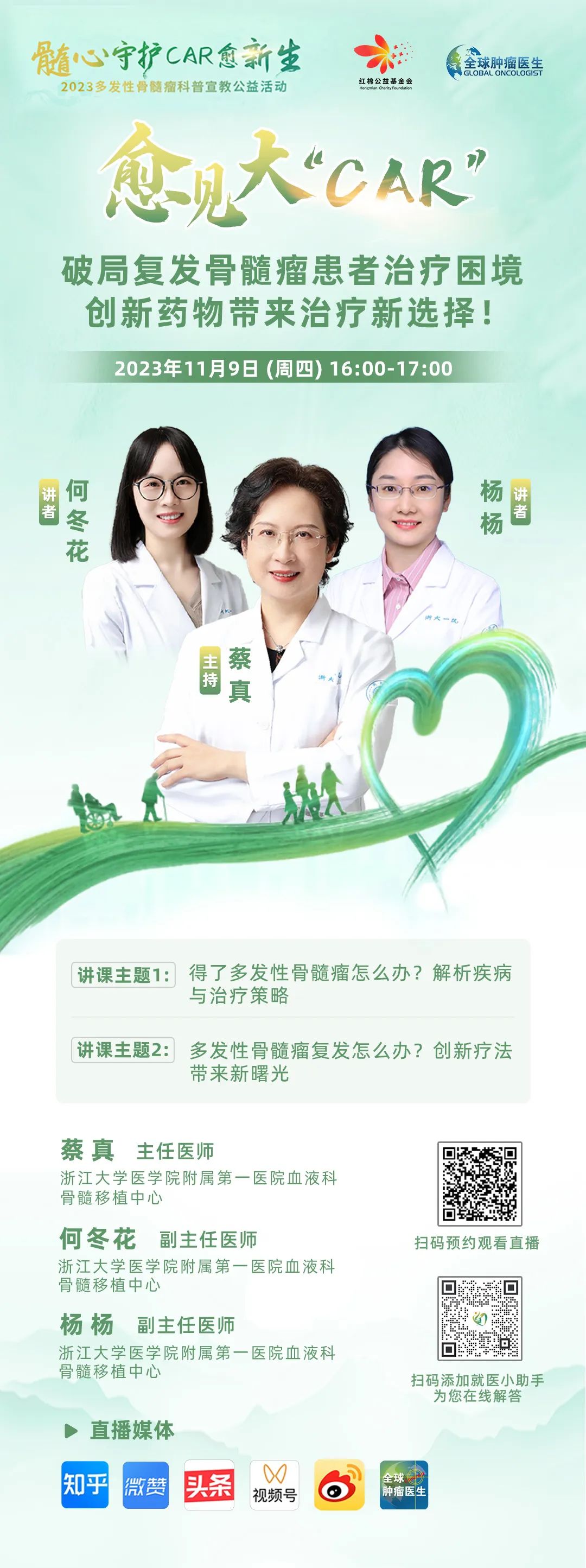 直播预告|愈见大"CAR",2023年11月9日16点浙江大学医学院附属第一医院血液科骨髓移植中心主任医师--蔡真教授团队:得了多发性骨髓瘤怎么办?疾病治疗策略和创新疗法详细解析