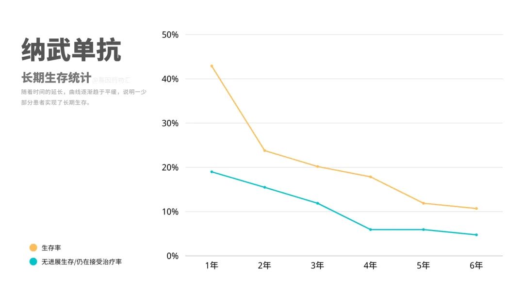 根据一项长期随访数据,接受纳武单抗治疗的晚期非小细胞肺癌患者,4年、5年和6年生存率分别为17.86%、11.9%和10.7%。画成生存期图像,曲线最终趋于平稳。