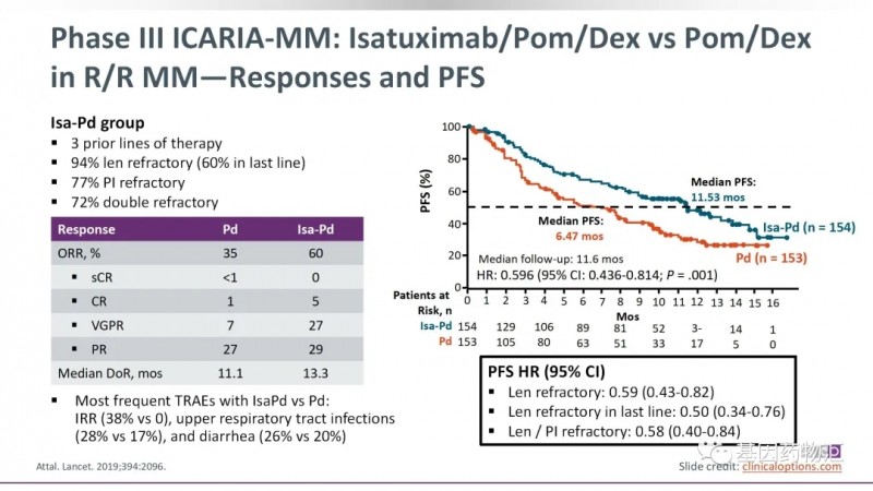 该批准基于Ⅲ期ICARIA-MM研究的结果,提示使用Sarclisa+泊马度胺+地塞米松方案,患者的无进展生存期和缓解率显著超过了泊马度胺+地塞米松的方案。