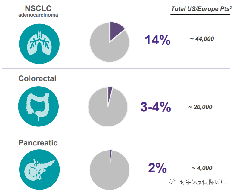 研究发现,KRASG12C是一种特定的KRAS亚突变,是第12个密码子的甘氨酸被半胱氨酸取代,约占所有KRAS突变的44%,其中非小细胞肺癌腺癌中最常见,占14%,其次是大肠腺癌占3~4%,胰腺癌占2%,全球每年超过100000人确诊为KRASG12C突变。