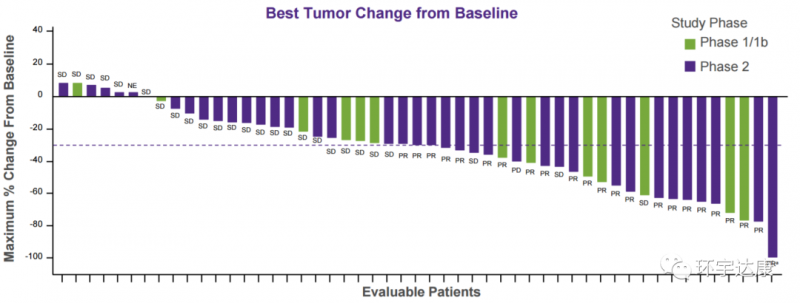 丹娜法伯癌症研究所Lowe胸腔肿瘤学中心主任PasiA.Jänne博士报告说,在参加该试验的51名KRASG12C突变非小细胞肺癌患者中,客观缓解率高达45%,这意味着将近一半的患者在接受Adagrasib(MRTX849)治疗后,肿瘤病灶缩小了30%以上,并且没有进展或扩散。51名患者中的49例实现了部分(PR)或完全缓解(CR)或疾病稳定(SD),疾病控制率高达96%。下面这张瀑布图清晰的反映出每天接受600mgAdagrasib(MRTX849)治疗的非小细胞肺癌患者有96%(49/51)观察到临床获益(DCR)。