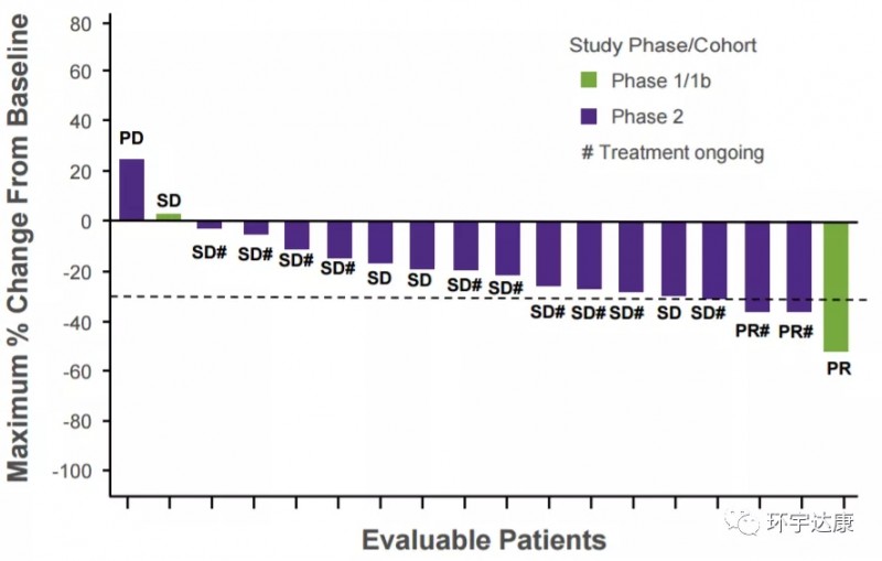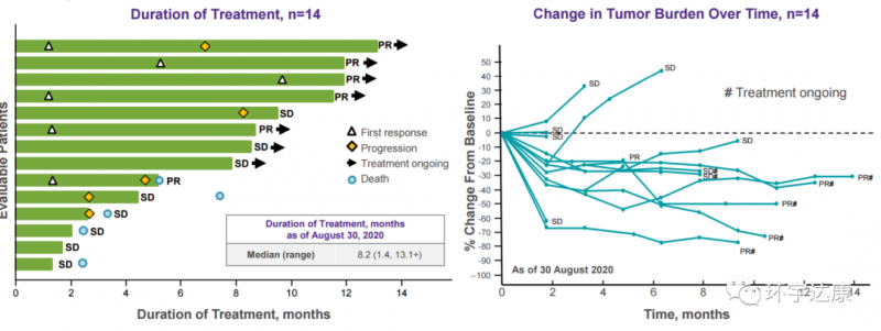 疾病控制率(DCR):高达94%,意味着18名患者中有17位能够临床获益,其中12名患者仍在接受治疗。18名患者中有10名已经接受了四个月以上的治疗。
