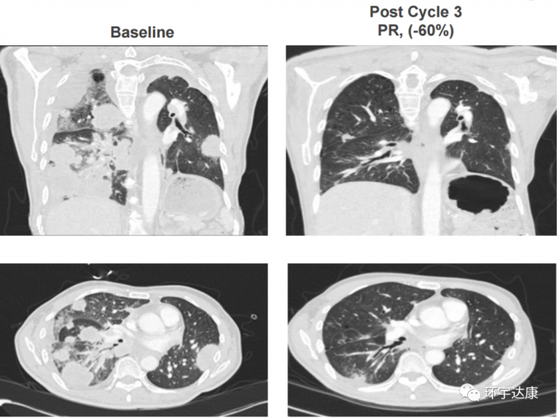 比如这位53岁的男性非小细胞肺癌患者,已经接受了数不清的化疗和免疫治疗,但是病情还是进展了,大家可以很清楚的看到他的双肺填满了肿瘤,属于非常晚期的难治性患者,在接受Adagrasib(MRTX849)联合TNO-155治疗一个周期后,颈部的肿块变平,他已经不再需要吸氧和轮椅,3个周期后,肿瘤就奇迹般的开始缩小了,影像学检查证实肿瘤减少了60%!