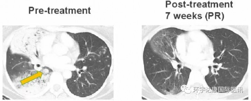 一位38岁的女士确诊为CD74-ROS1融合阳性非小细胞肺癌,之前接受过化疗和克唑替尼的治疗,但是出现了一种新的耐药突变ROS1G2032,患者接受Taletrectinib(600mg,QD)治疗,在第7周时,肺部肿瘤迅速缩小,评效为部分缓解(PR),目前该患者仍在接受治疗中。