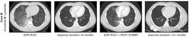 患者一线便接受了克唑替尼治疗,持续缓解整整44个月!后续在右下肺发现了新的病灶,并重新接受了基因检测(二代测序),并确认了耐药突变EZR-ROS1融合以及ROS1-S1986F突变。