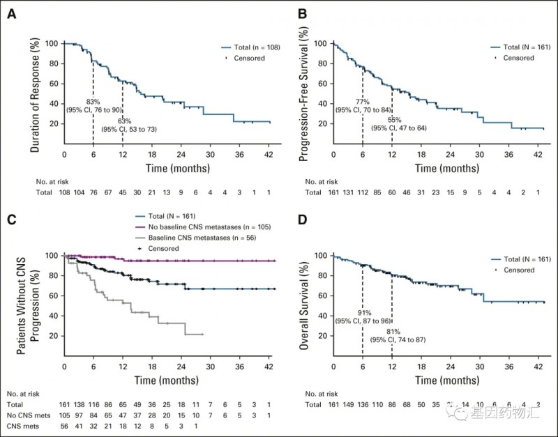 截至数据结束时,大部分的患者能够保持无进展生存,中位无进展生存期为15.7个月;在脑转移患者中,中位无进展生存期为8.3个月。