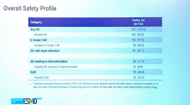 和药物相关的3级以上不良反应48.2%,严重不良反应18.5%,37.7%的患者需要减量,17.3%的患者因为无法耐受不良反应而终止治疗。