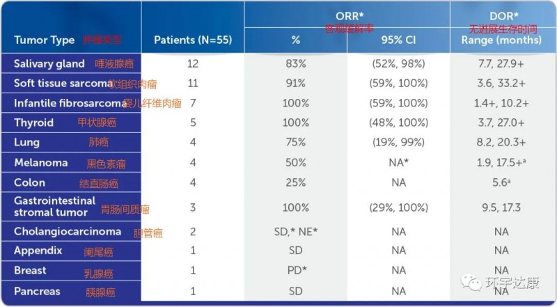 在实验中,这些患者肿瘤类型包括10种不同的软组织肉瘤,唾液腺癌,婴儿纤维肉瘤,甲状腺,肺,黑素瘤,结肠,胃肠道间质瘤(GIST),乳腺癌,骨肉瘤,胆管癌,原发性未知癌,先天性中胚层肾癌,阑尾和胰腺癌。