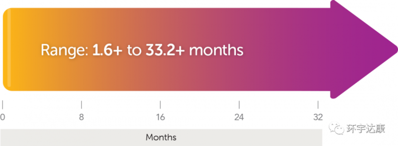 在三项larotrectinib临床试验(NCT02122913、NCT02576431和NCT02637687)扩大的汇总数据集中,对罹患21种不同的肿瘤类型的206例可评估成人和儿童TRK融合肿瘤患者进行了更长时间的随访(截止到2020年7月20日),研究者评估的总体缓解率(ORR)为75%,包括22%完全缓解(n=45)。对于可评估的脑转移患者(n=15),ORR为73%。在全部可评估的患者中,中位随访时间为22.3个月,中位缓解持续时间(DoR)为49.3个月,超过4年!