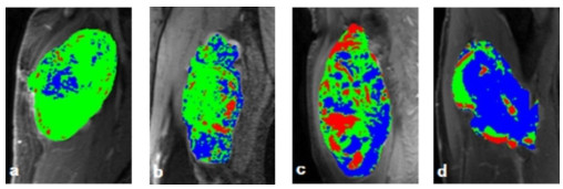 图2.不同疗效病例的体素分布图。由a到d,F0依次减少,F-依次增加,TCNR依次减少,疗效依次降低。a:TCNR95%,F0=85%,F-=11%;b:TCNR=85%,F0=63%,F-=30%;c:TCNR=50%,F0=50%,F-=31%;d:TCNR=30%,F0=27%,F-=67%.