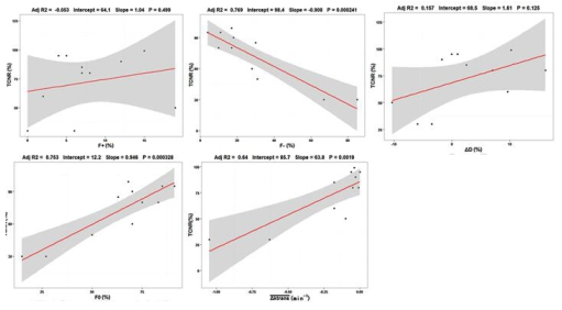 图3.预测指标与TCNR的线性回归结果。红线为回归直线,阴影区域为回归结果的95%置信区间。相对于其他预测指标,F0和F-的散点更加集中分布于回归直线附近,且回归系数更大,说明F0和F-与TCNR的线性关系更强。