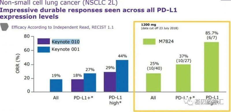 其中,500mg剂量组患者的整体缓解率为17.5%,1200mg剂量组的患者整体缓解率为25.0%;而在1200mg剂量组中,PD-L1表达阳性的患者整体缓解率为36.0%;在PD-L1表达水平≥80%的患者亚组中,患者的整体缓解率更是达到了85.7%!