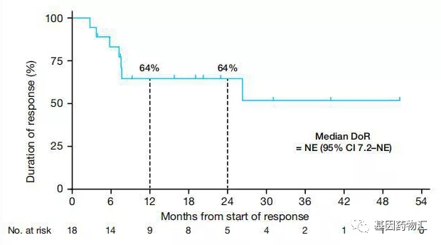 在缓解率较高的同时,拉罗替尼治疗也取得了持久的缓解时间。中位随访22.9个月时,仍有超过一半的患者保持临床缓解;24个月时,患者的缓解持续率为68%。