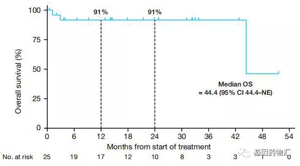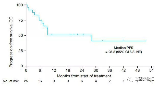 整体来说,所有患者的中位无进展生存期为28.3个月;24个月无进展生存率52%。