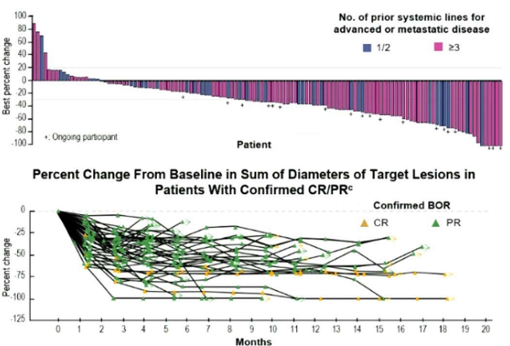 结果显示:这部分患者接受HER3-Dxd治疗后,整体客观缓解率为29.2%(客观缓解率指肿瘤缩小超过30%的患者比例),疾病控制率为72.7%(指瘤体缩小患者及瘤体增大但未超过20%的患者之和所占比例),中位PFS(可以理解为所有患者平均疾病控制时间)为5.5个月,中位OS(可以理解为全部患者的平均生存时间)为11.9个月。