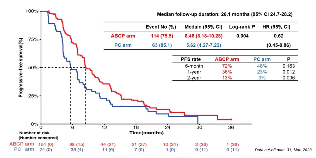 数据发现,四药组和双药组的中位PFS为6.9个月和4.3个月,降低疾病进展或死亡风险达54%,两组ORR分别为44%和25%,DCR分别为83%和72%。