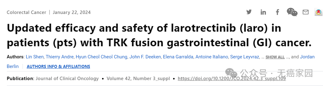2024年1月18日~20日召开的美国临床肿瘤学会年会胃肠肿瘤研讨会(ASCOGI)上,研究人员提交了关于拉罗替尼(Larotrectinib)治疗NTRK融合阳性胃肠道癌患者的最新研究数据,效果格外惊艳!
