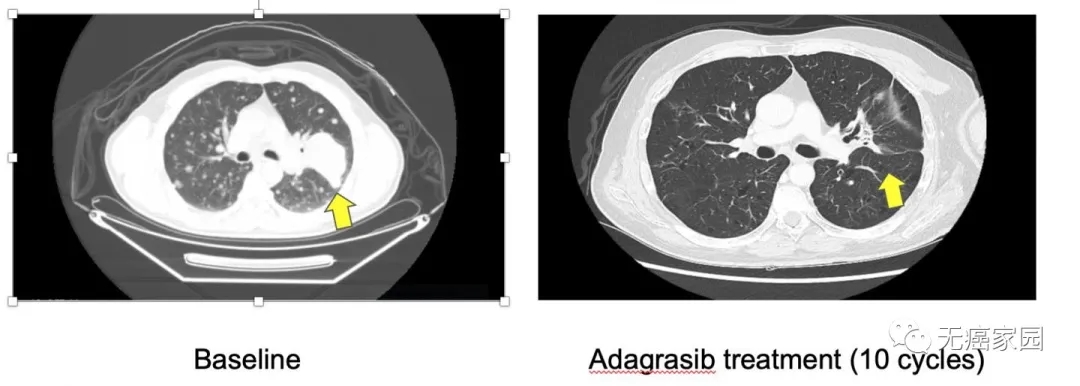 使用adagrasib治疗前后的患者CT扫描。黄色箭头标记主要肿瘤的位置。