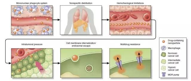 纳米药物体内输送屏障:单核巨噬系统吞噬、非特异性分布、瘤内压、血液流变学限制、细胞摄取及内涵体逃逸、多药耐药性(图片来源:NatureBiotechnology)
