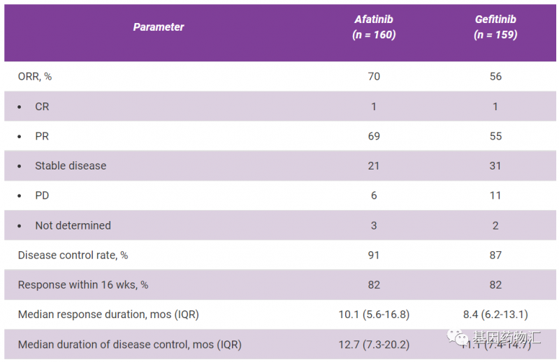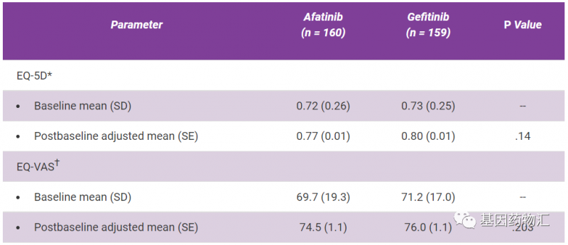 在严重的治疗相关不良事件发生率方面,阿法替尼治疗为11%,其中最常见的是腹泻(6%);吉非替尼为4%,其中最常见的包括间质性肺病(3%)和腹泻(1%)。