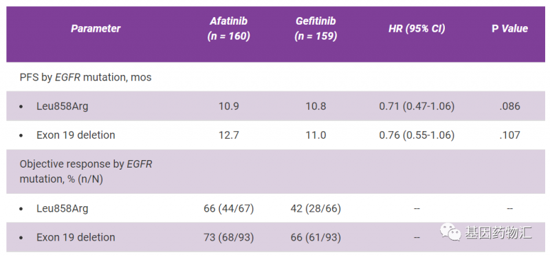 接受治疗的患者主要分为Leu858Arg和Exon19deletion两个突变亚型,两个亚型的患者接受两种方案治疗的中位无进展生存期与整体数据一直,差别不大(10.9个月vs10.8个月;12.7个月vs11.0个月),且整体缓解率之间的差异与整体数据也类似(66%vs42%;73%vs66%)。