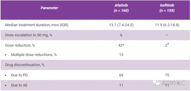 接受阿法替尼治疗的患者中,42%在治疗过程中降低了剂量,其中13%的患者多次降低治疗剂量;而接受吉非替尼治疗的患者仅有2%的患者降低了治疗剂量。
