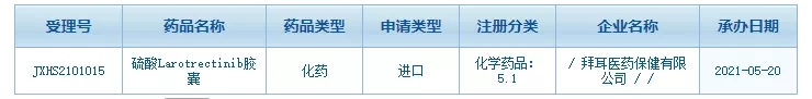 今年5月20日,CDE官网显示,拜耳在国内递交硫酸Larotrectinib胶囊上市申请并获受理(受理号:JXHS2101015)。这意味着,全球首款不区分肿瘤来源的泛癌种靶向药有望在国内获批,相信在不远的将来,国内的癌症患者会迎来这款“治愈系”抗癌药。