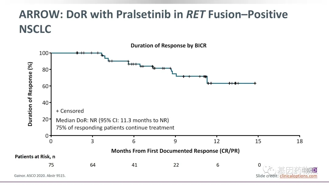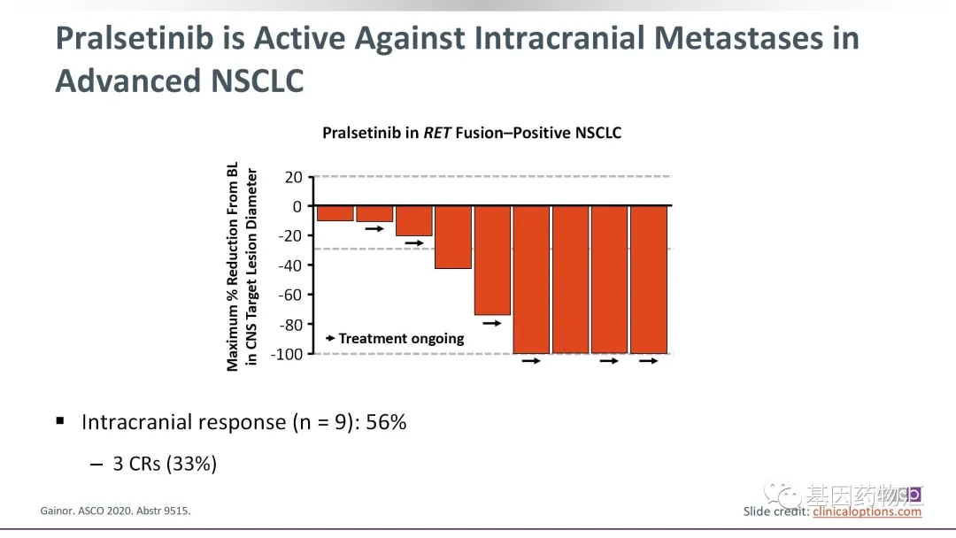 ARROW试验评估了普雷西替尼(Pralsetinib,BLU-667)治疗RET阳性非小细胞肺癌患者的疗效,同样纳入了初治患者与经治患者,并包括了一部分基线存在脑转移的患者。