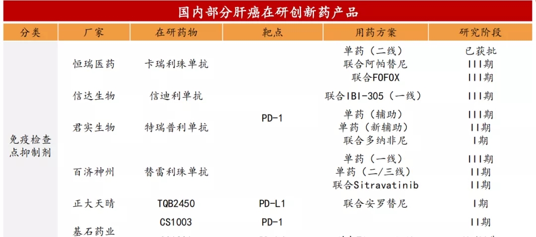 全球来看,针对HCC适应症的药物研发仍以免疫检查点抑制剂为主,小分子靶向药多数以VEGFR、FGFR、PDGFR、c-MET等多靶点抑制剂为主;恒瑞、信达、君实、百济等位于国内PD-1研发第一梯队的企业均将肝癌作为适应症布局的重点领域小分子靶向药领域部分企业也在差异化布局肝癌用药的研发;如泽璟制药(氘代索拉非尼,Raf,MEK,ERK,VEGFR,PDGFR多靶点药物),众生药业,广生堂。
