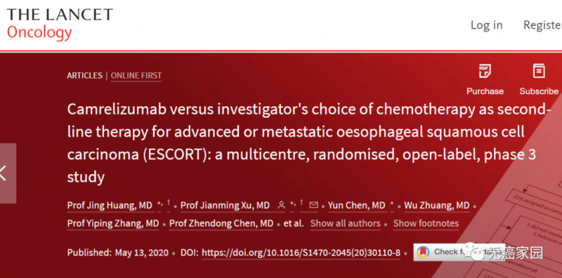 5月13日,国际顶级学术期刊《TheLancetoncology(柳叶刀middot;肿瘤学)》发表了关于卡瑞利珠单抗在既往接受一线化疗失败的晚期或转移性食管癌患者中的临床研究。其中,以中国医学科学院肿瘤医院黄镜教授、解放军总医院第五医学中心徐建明教授、复旦大学附属肿瘤医院赵快乐教授为共同的第一作者。