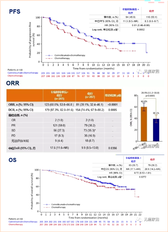 结果显示,卡瑞利珠单抗+化疗组相比化疗组显著延长PFS(中位11.3vs8.3个月,HR=0.61),显著提高ORR(60.0%vs39.1%)、OS:NRvs20.9个月(死亡风险降低28%),3/4级TRAEs发生率相似(66.3%vs45.9%)。