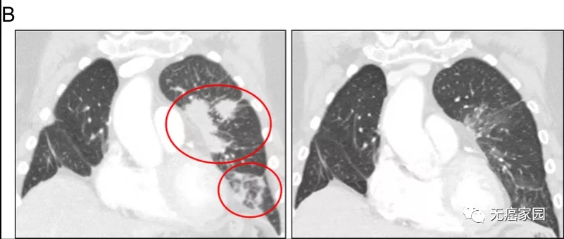 患者2对奥希替尼和BLU-667的治疗反应,与基线(左)相比,左上叶和左下叶肺混浊(右;圈出)有显著改善。