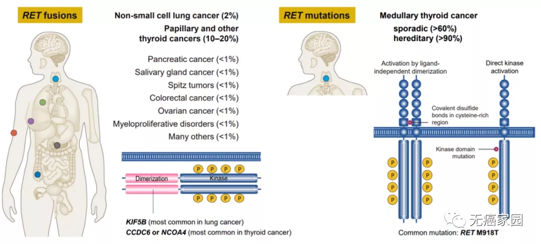 RET融合:非小细胞肺癌2%,甲状腺癌10%·20%,胰腺癌1%,唾液腺癌1%,结直肠癌1%,卵巢癌1%;